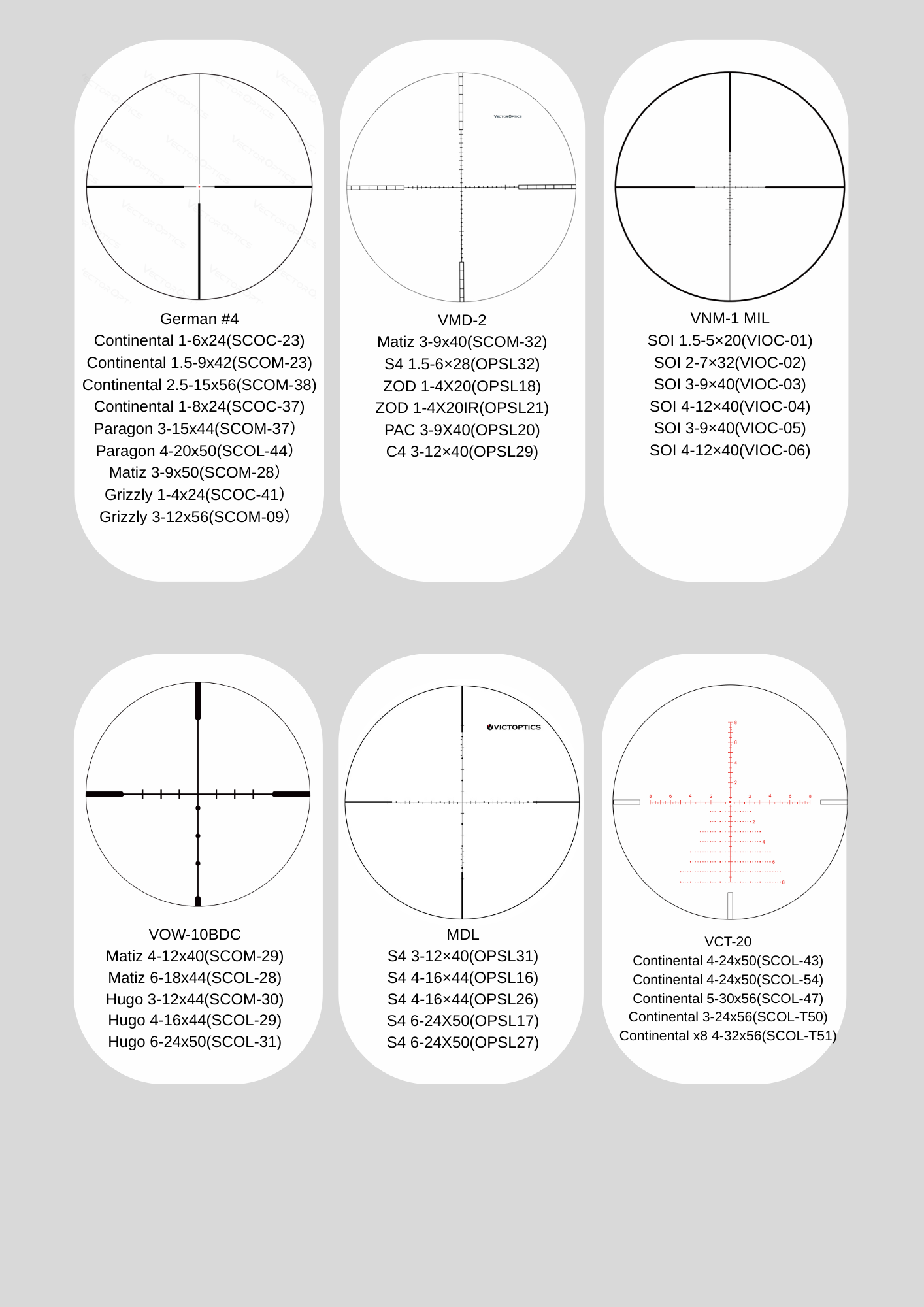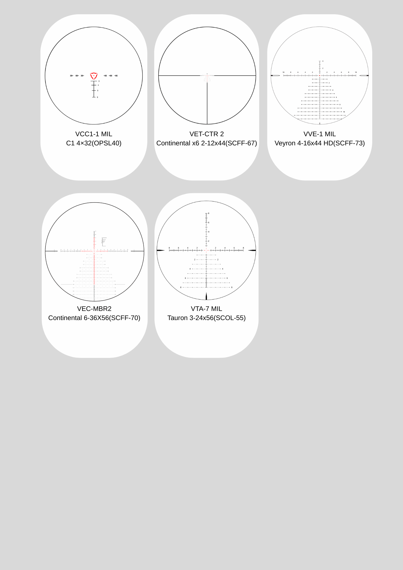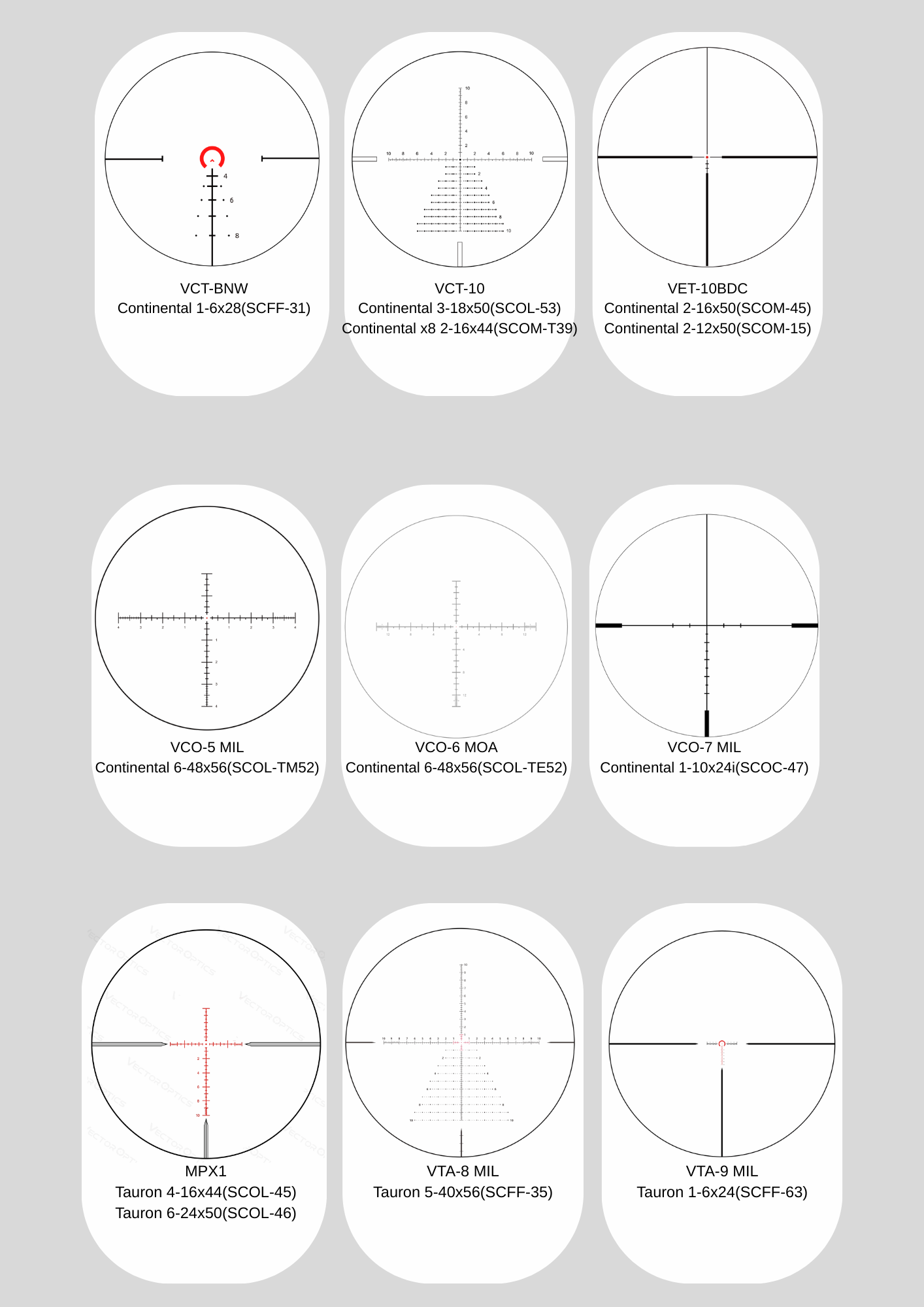 Bu grup, özellikle yüksek büyütmeli Continental ve Tauron serisi dürbünlerle birlikte kullanılan, mil tabanlı ince yapılı reticle tasarımlarını içerir. Amaç, uzun mesafede hedefi mümkün olduğunca az kapatan, aynı zamanda hassas tıklama ve holdover/holdoff kullanımına izin veren bir yapı sunmaktır.