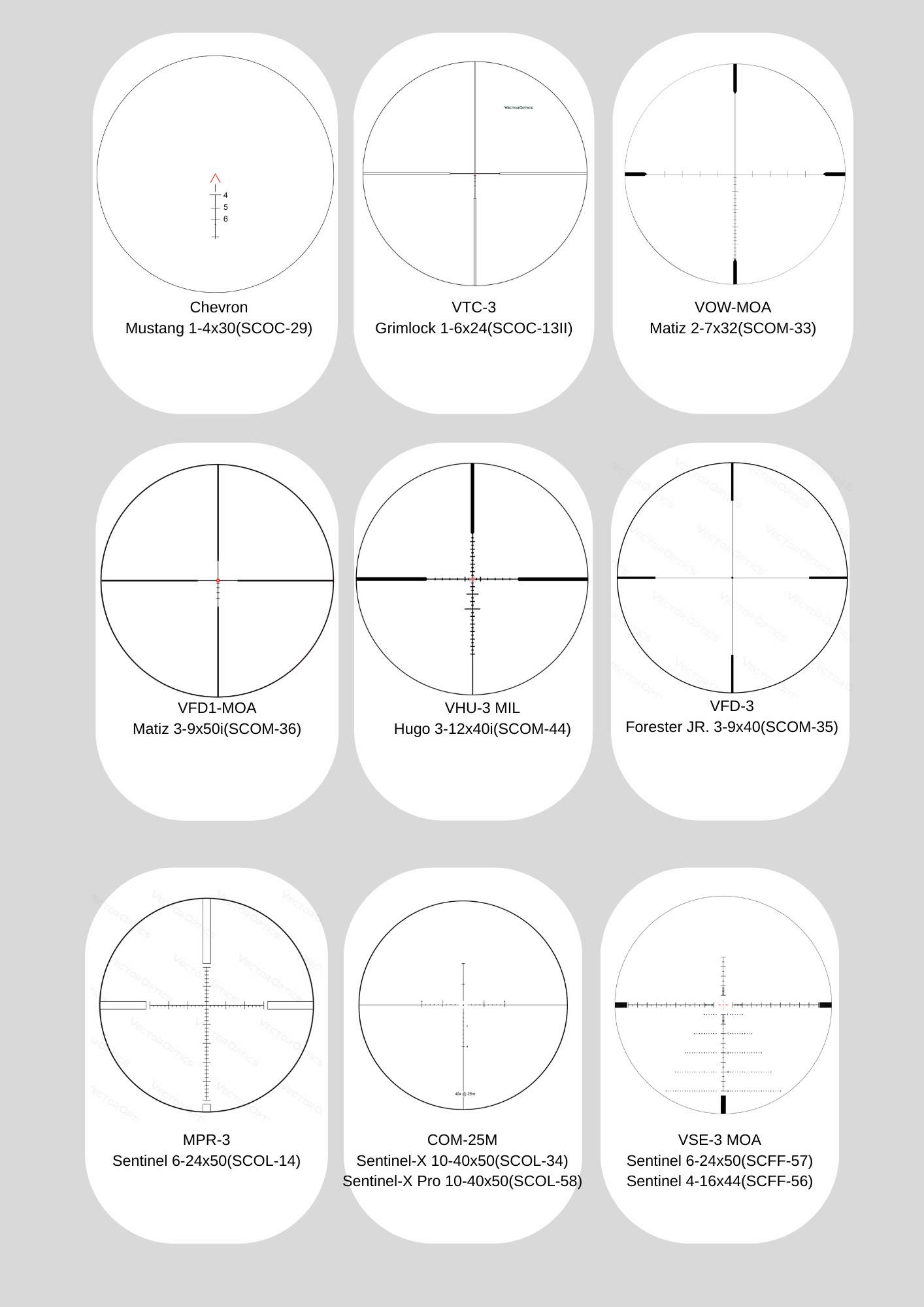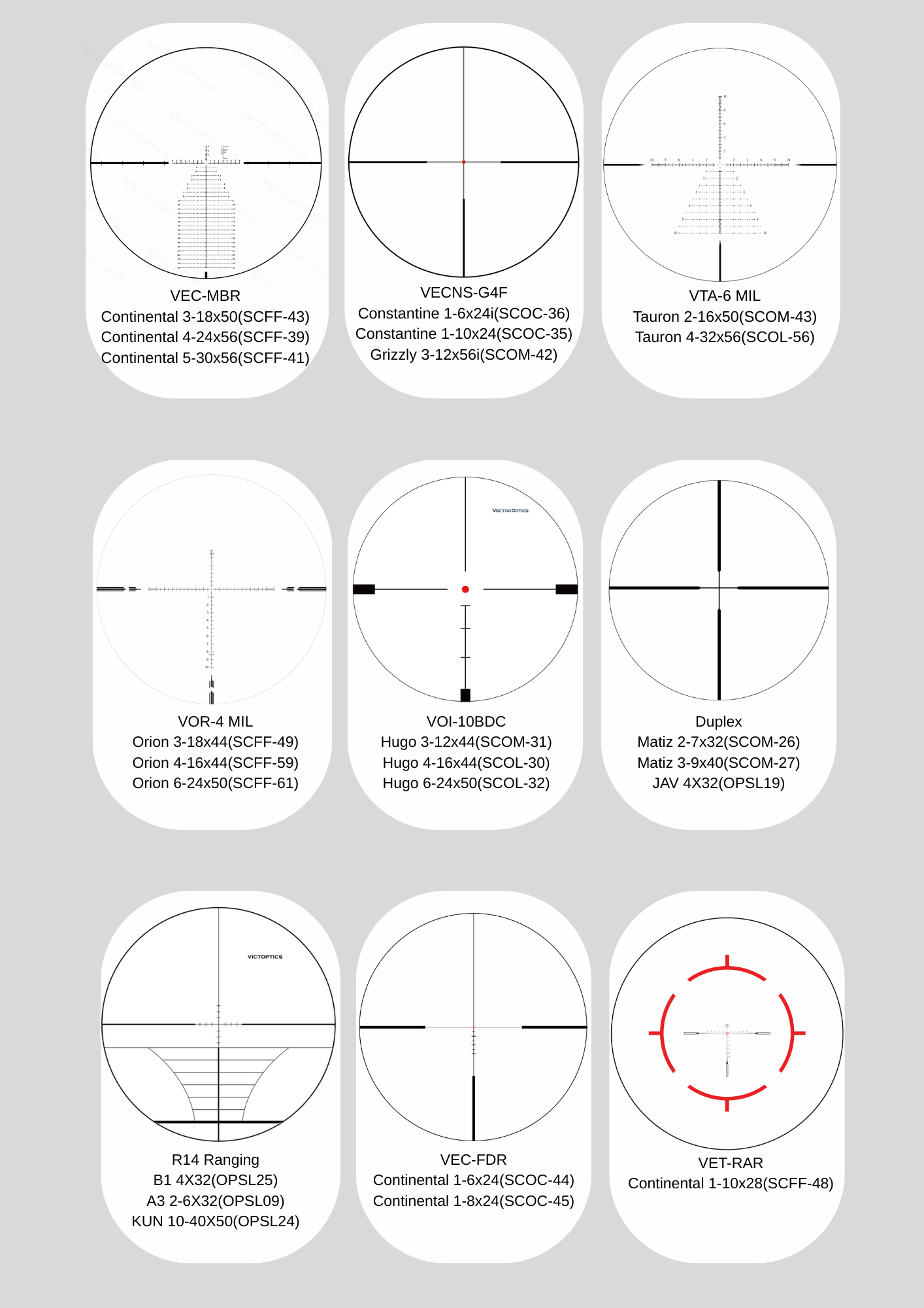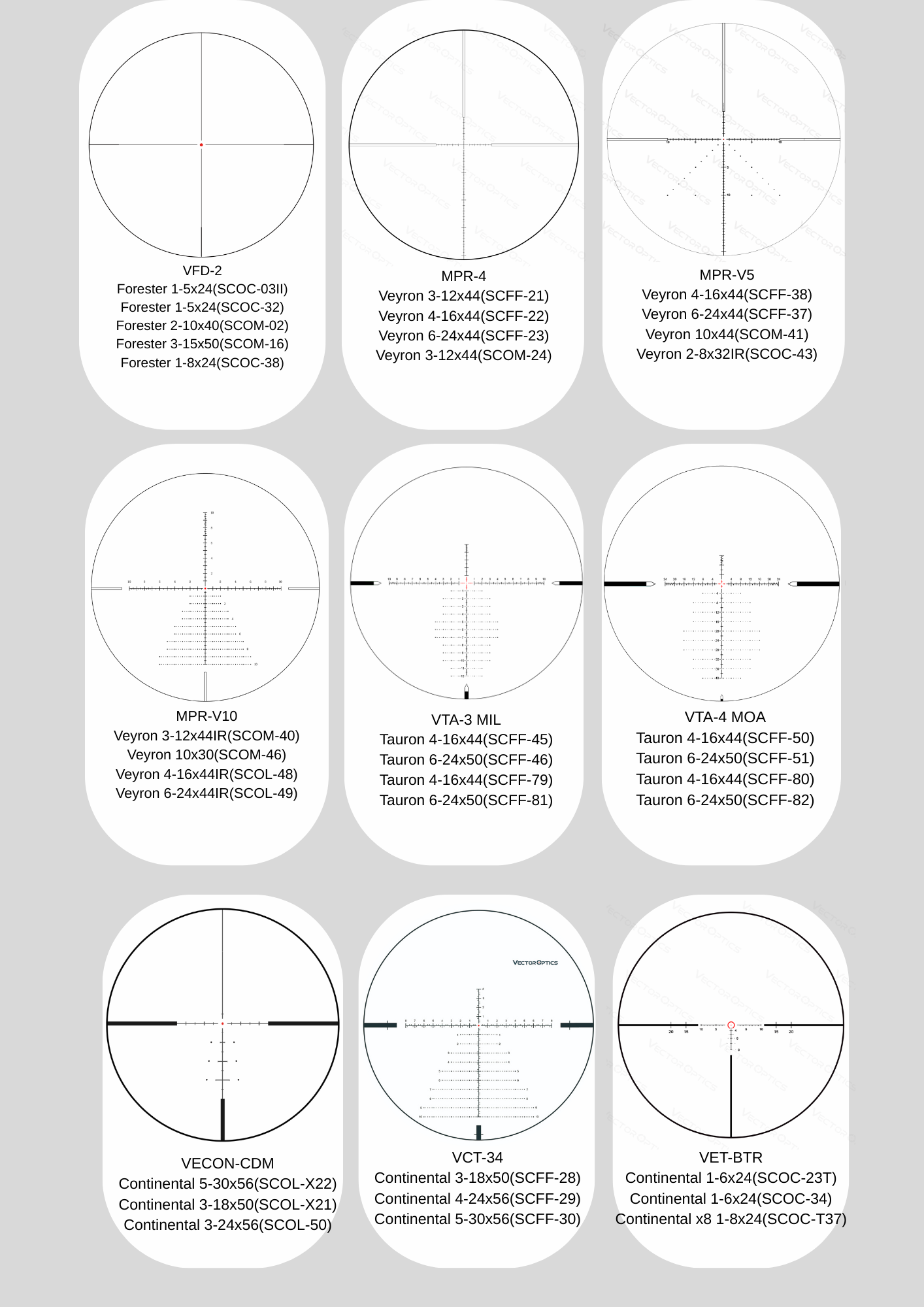 Vector Optics, FFP (First Focal Plane) ve SFP (Second Focal Plane) konfigürasyonlarında, hassas benchrest ve uzun menzil atışlarından hızlı taktik atışlara kadar her ihtiyaca göre optimize edilmiş reticle seçenekleri sunar.