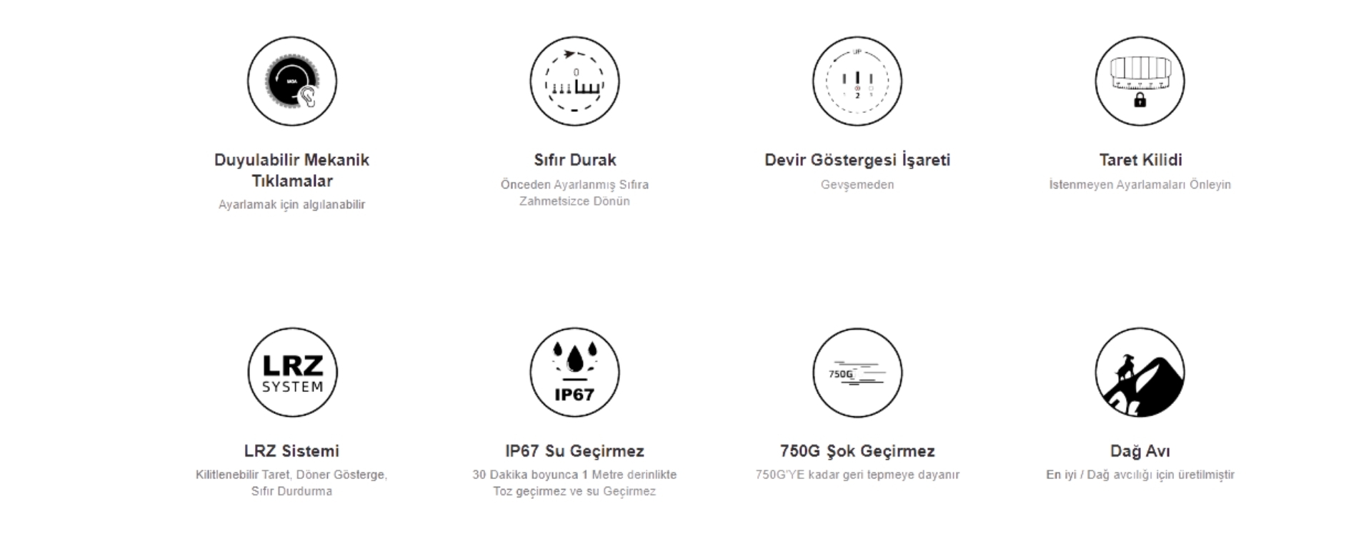- zero stop + taret kilidi: sıfıra hızlı dönüş ve istenmeyen ayarı azaltma