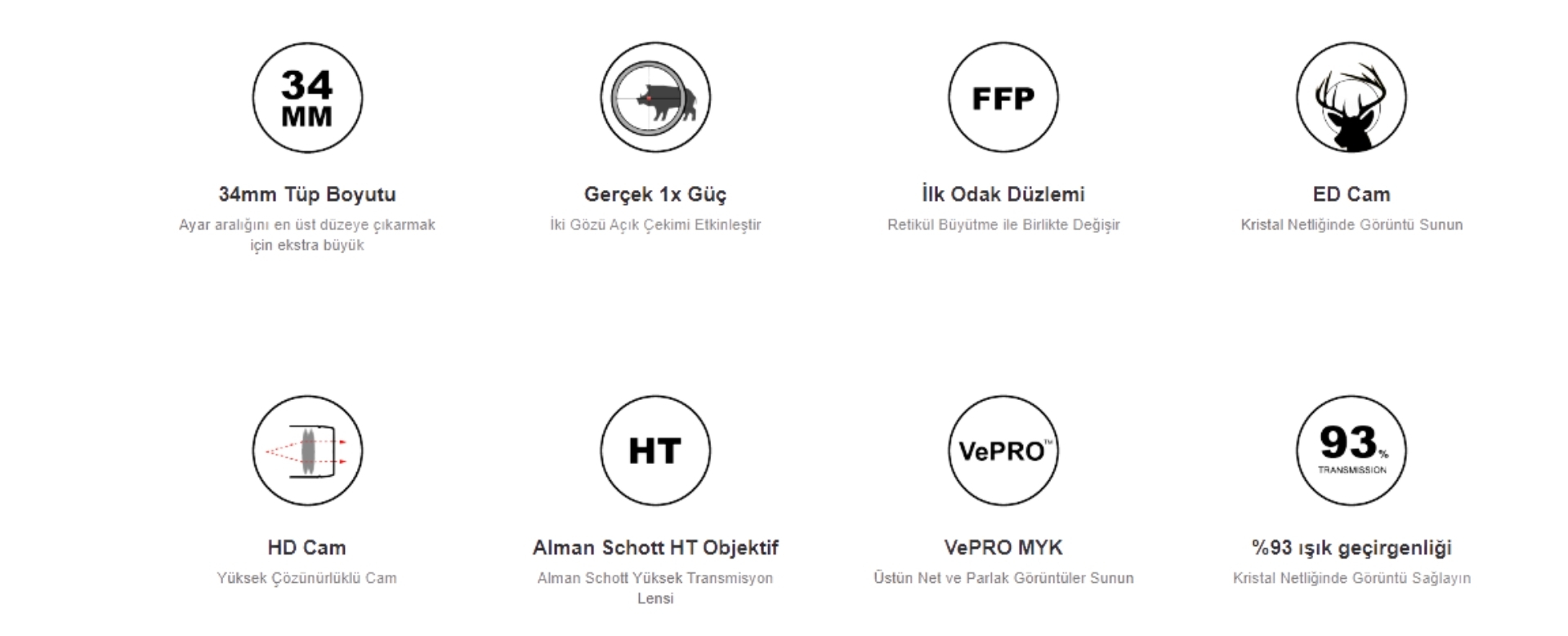 Optik tarafta üretici; Alman Schott HT, LaREE HD, VePRO FMC ve ED cam kombinasyonu ile %93 ışık geçirgenliği vurgusu yapar. Tamamen çok kaplamalı lens yapısı, yansımayı/parlamayı azaltıp daha net nişan ve daha yüksek kontrast hedefler.