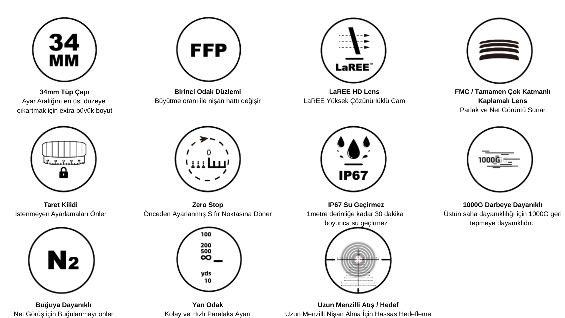 34 mm tüp çapı, yüksek ayar kapasitesini destekler ve yükseklikte ≥32 MIL aralık sunar. Yükseklik tarafında zero stop ve taret göstergesi, sıfıra dönüşü hızlandırır ve tur takibini kolaylaştırır. Rüzgar taretindeki kilit sistemi, ayarın kazara kaymasını azaltır.